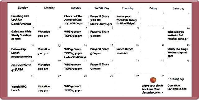 At Blue Ridge our priorities are simple: To love each other, to love our Savior, and to share Jesus' love with our world. Blue Ridge is a place of excitement and growth. We specialize in ministering to the needs of families. We at Blue Ridge love children and youth and provide monthly activities for them to fellowship together. Our Bible Study classes "meet and eat" outside the walls of the church often as well.