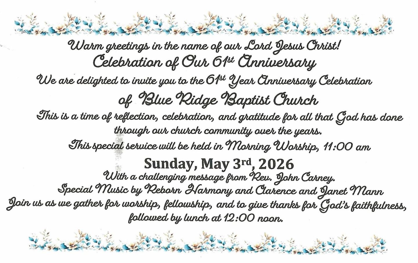 May 3rd - 61st Anniversary of Blue Ridge Baptist