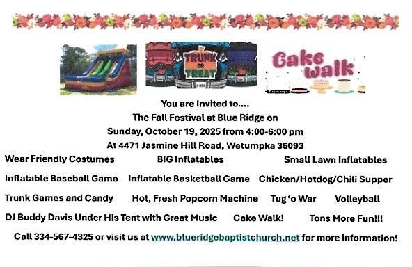 Food, Fellowship, Trunk or Treat, Games at every Car Trunk. Big inflatables with Giant Slide, Baseball Air Pitch, Basketball Throw.
