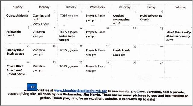We have postcards and will soon have our new Member Directories available on the table at the back of the church. Let people now much you enjoy being in the Blue Ridge Baptist Church Family.